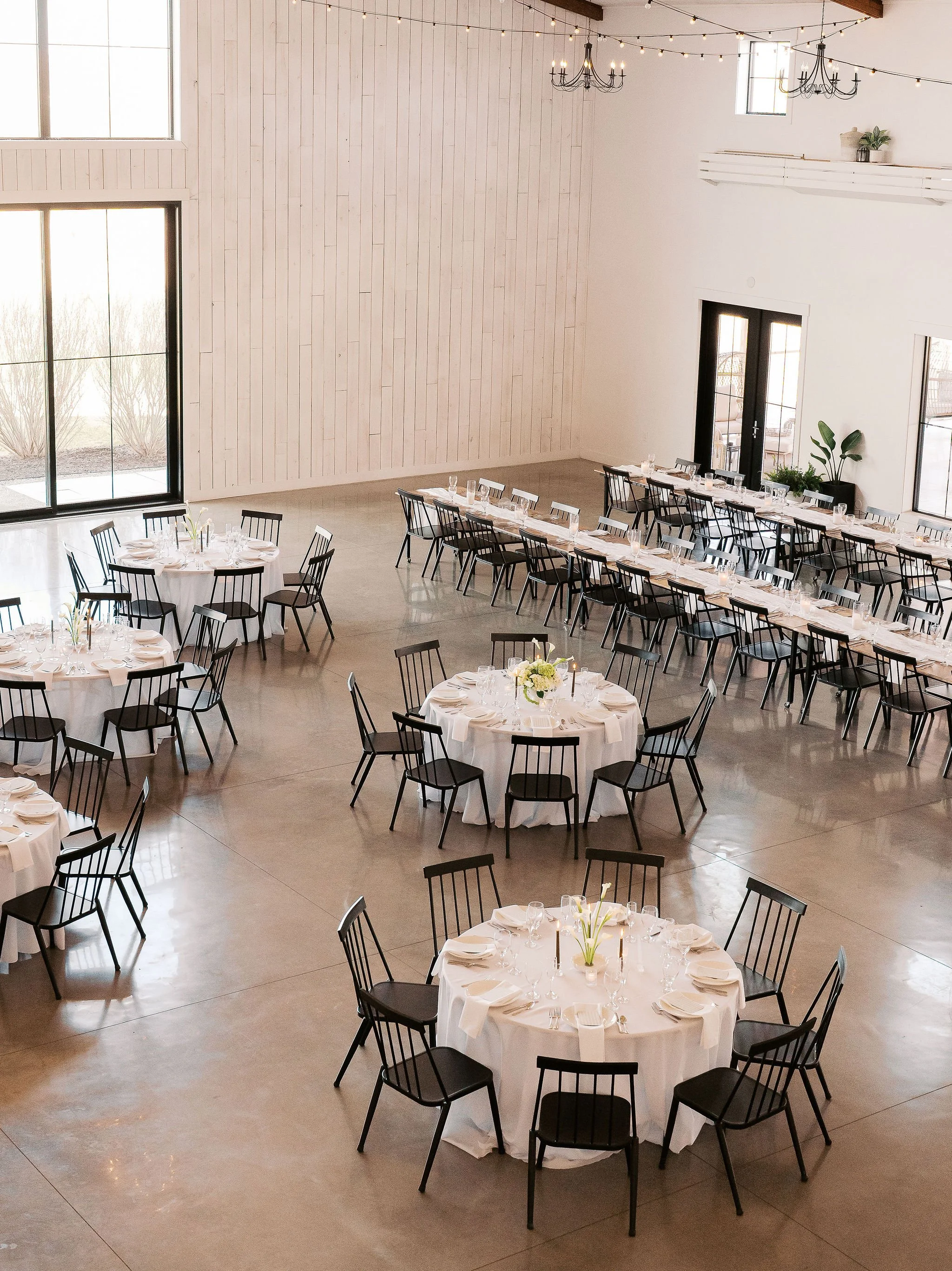 We provide handcrafted farmhouse tables with a mix of elevated round tables and modern black chairs. Our team will always set up the tables and chairs provided with the rental. We will also help you decide on the best layout for you based on your guest count.